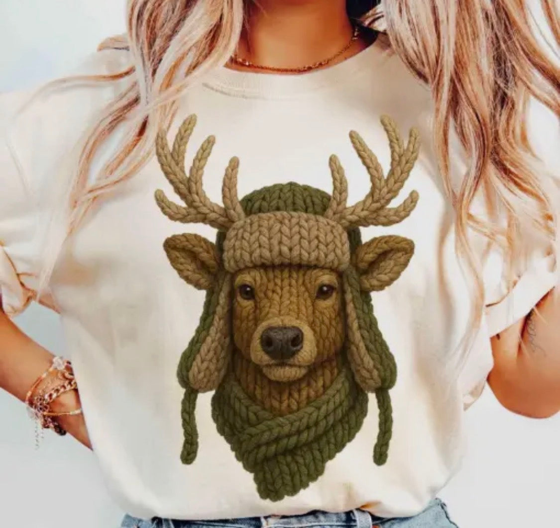 Our Knit Camo Buck Graphic features a detailed deer design that looks like it’s been hand-knitted, complete with antlers and a cozy camo trapper hat. The texture and depth of this graphic make it feel warm, rustic, and perfectly on trend.